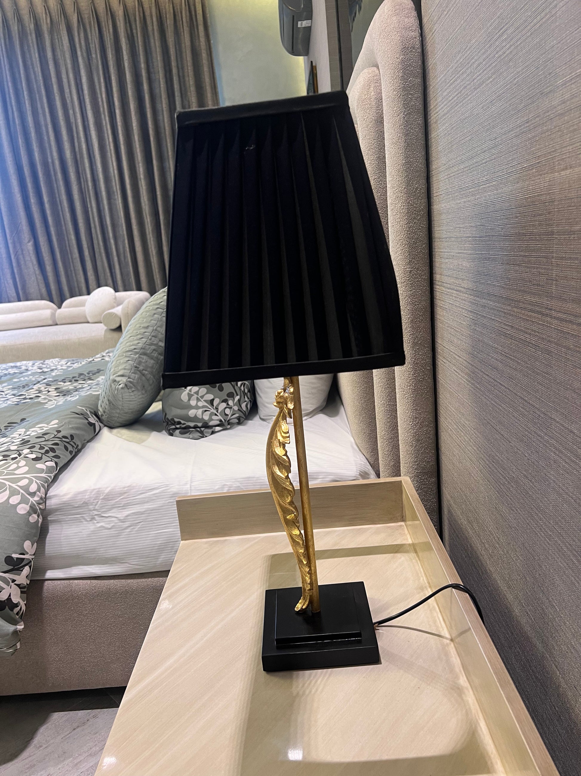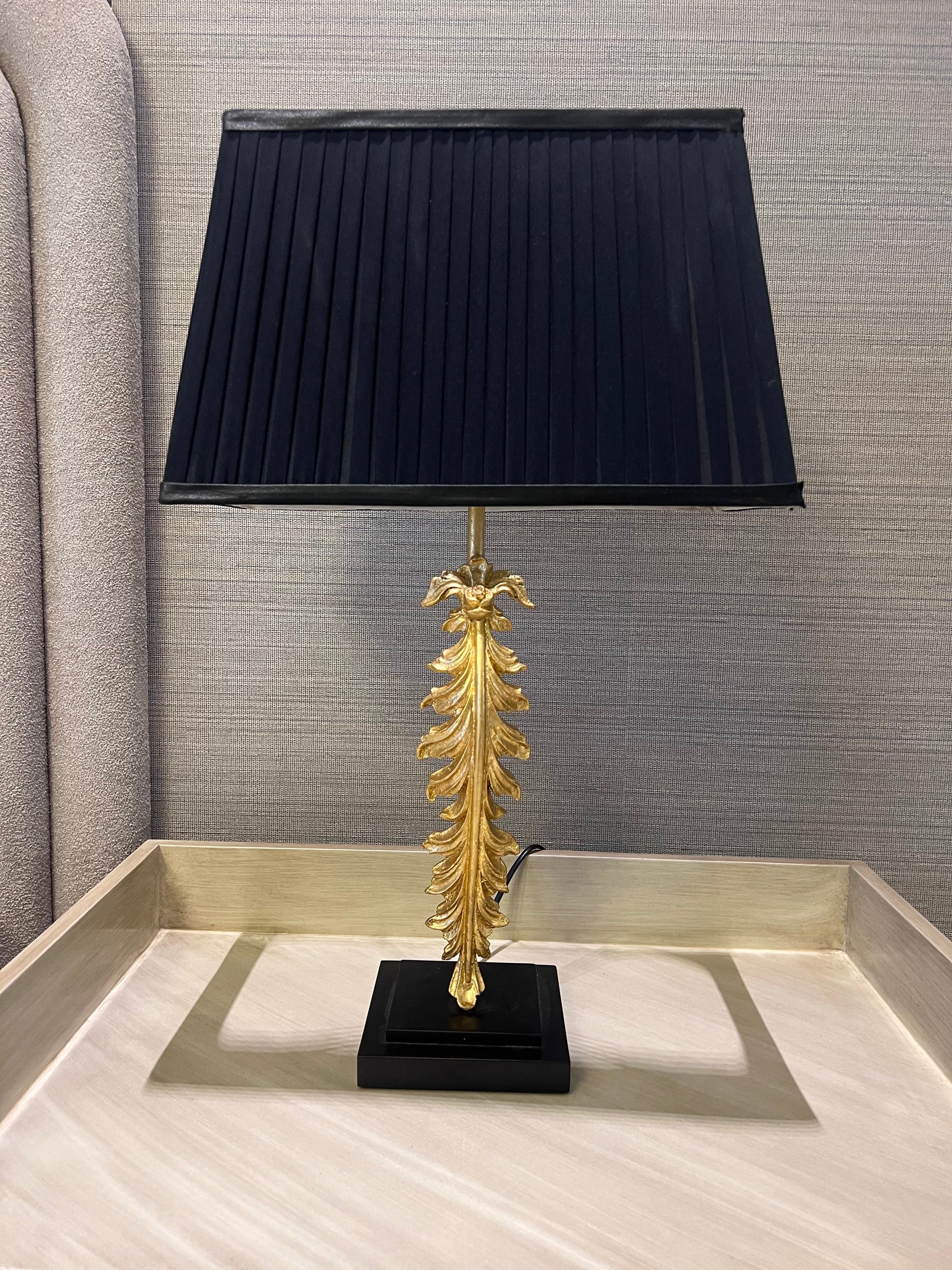 Elevate your space with timeless elegance using our Acanthus Leaf Table Lamp. Inspired by classical design elements, this lamp features a sculpted golden acanthus leaf stem, beautifully detailed to bring a touch of sophistication and artistry to any room. The black pleated lampshade adds a striking contrast, casting a warm, ambient glow through its textured finish.
