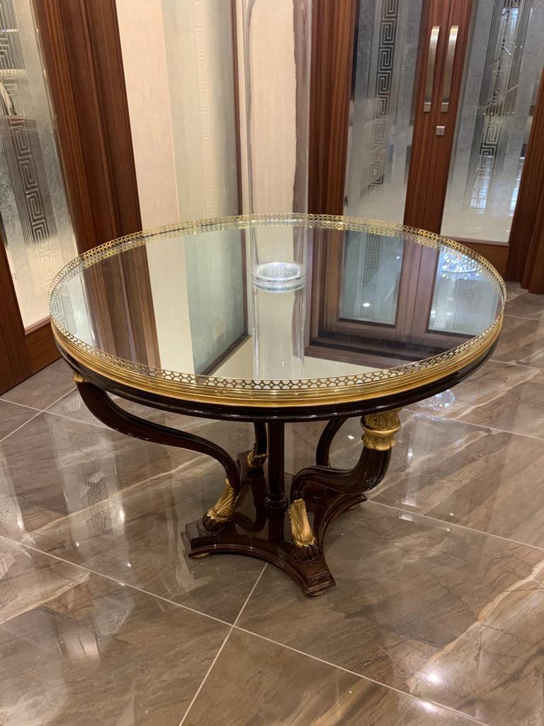 Delicate brass latticework surrounds the tabletop, adding a classic, sophisticated flair. -