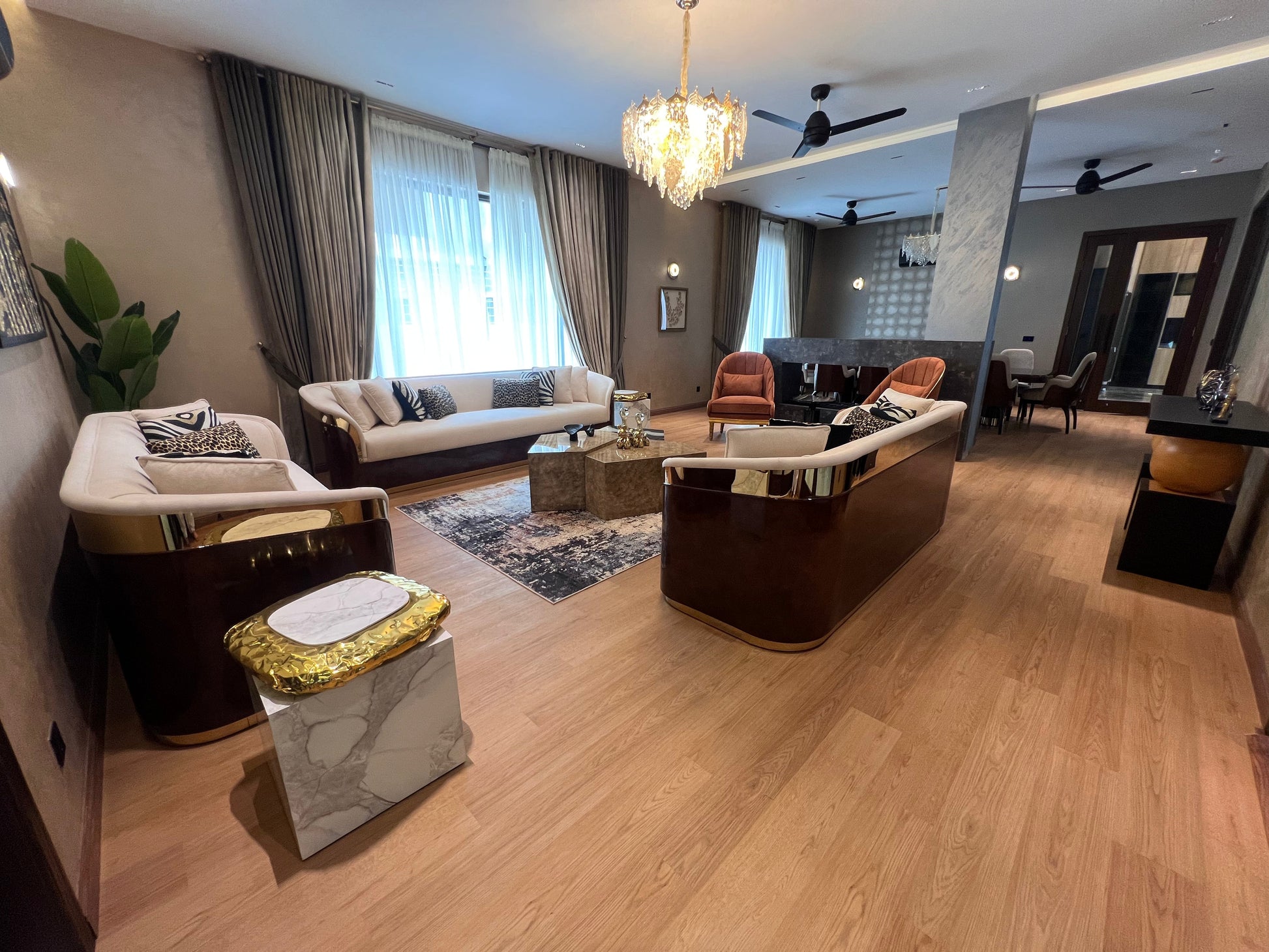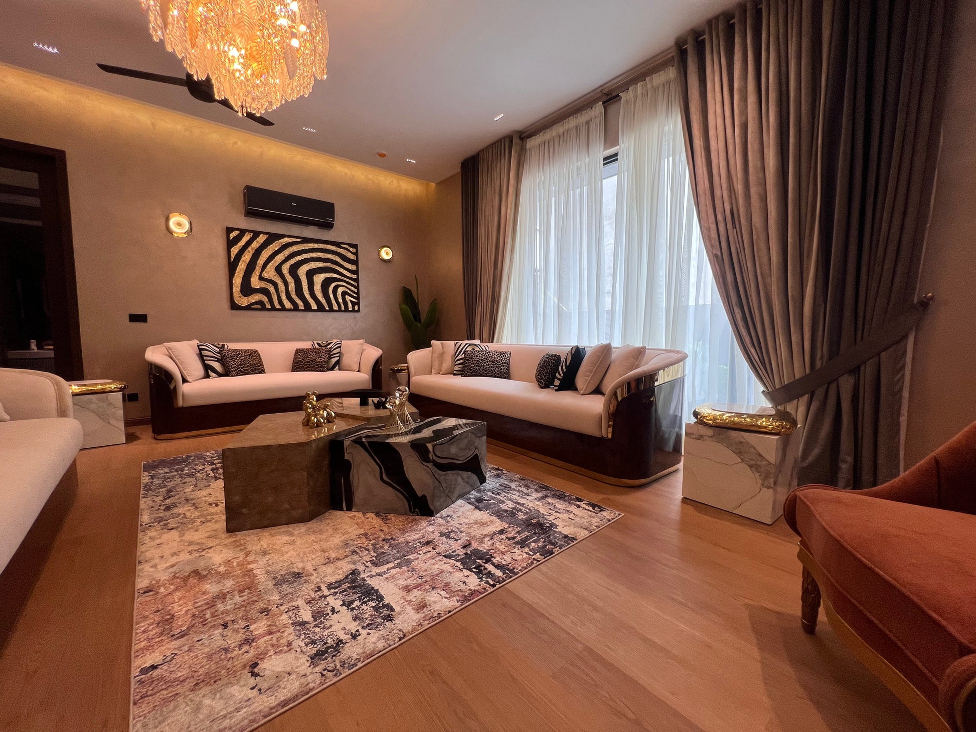 This drawing room exudes a luxurious and contemporary aesthetic, blending rich textures and bold patterns with a warm, inviting atmosphere. The dominant color palette consists of creams, browns, and golds, accented by striking black and white elements and touches of burnt orange.