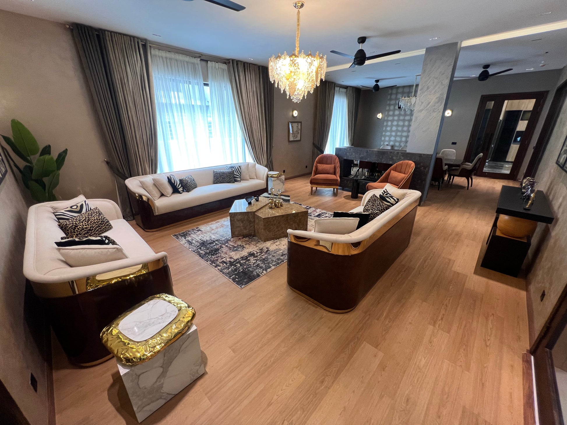 The room is furnished with several plush seating areas. Two cream-colored sofas with dark wood and gold accents are arranged opposite each other, each adorned with decorative throw pillows featuring a black and white animal print. A unique, white and dark brown sofa with prominent gold trim provides additional seating, continuing the sophisticated theme. Two burnt orange armchairs offer a pop of color and a more intimate seating arrangement.