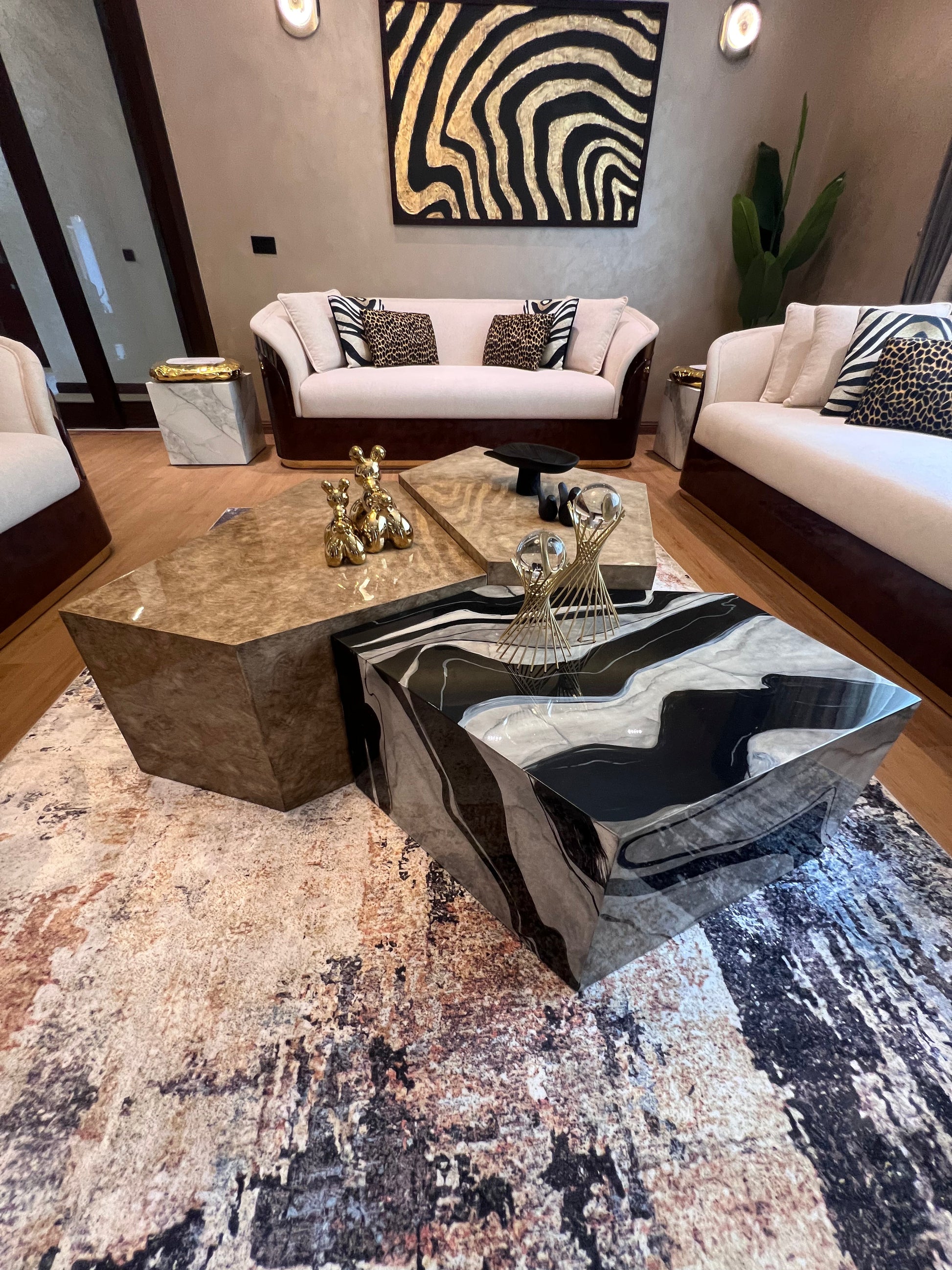 In the center of the room, a multi-tiered coffee table with a mix of marble-like and dark reflective surfaces sits atop a patterned area rug with muted purples, creams, and grays. Complementing the coffee table are several side tables, some with a white marble-like finish and gold tops, adding to the opulent feel.