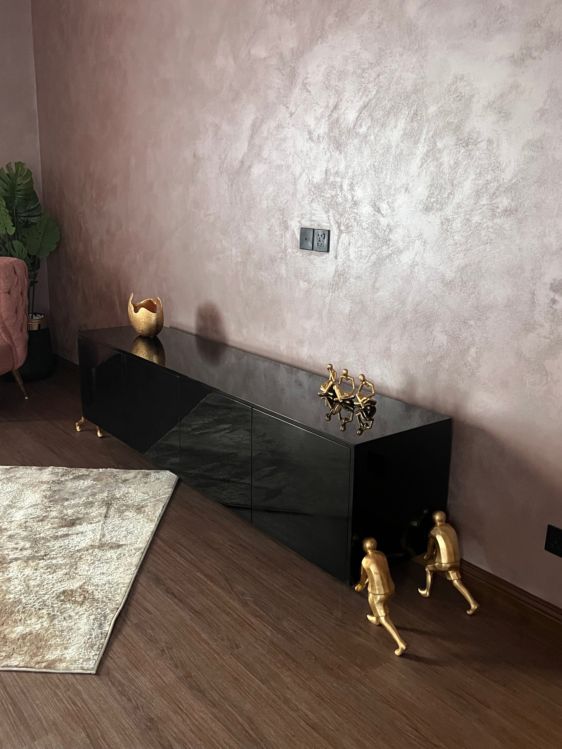 This striking console table is a bold statement piece, seamlessly blending functional design with artistic flair. Crafted with a high-gloss black lacquer finish, its sleek surface reflects light, adding a touch of contemporary sophistication to the room. The console features subtle geometric detailing on its cabinet doors, adding visual interest without disrupting its smooth silhouette. It stands on delicate golden feet, which provide a luxurious accent and a subtle lift.